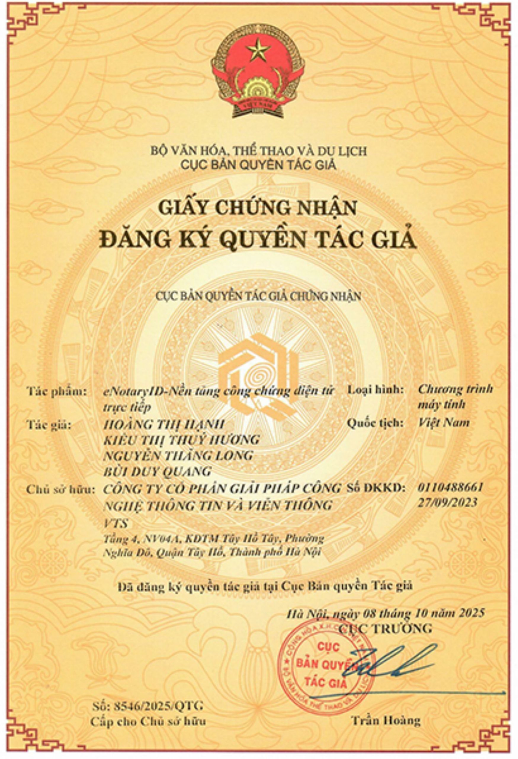 Giấy chứng nhận quyền tác giả nền tảng eNotaryID – Công ty VTS.