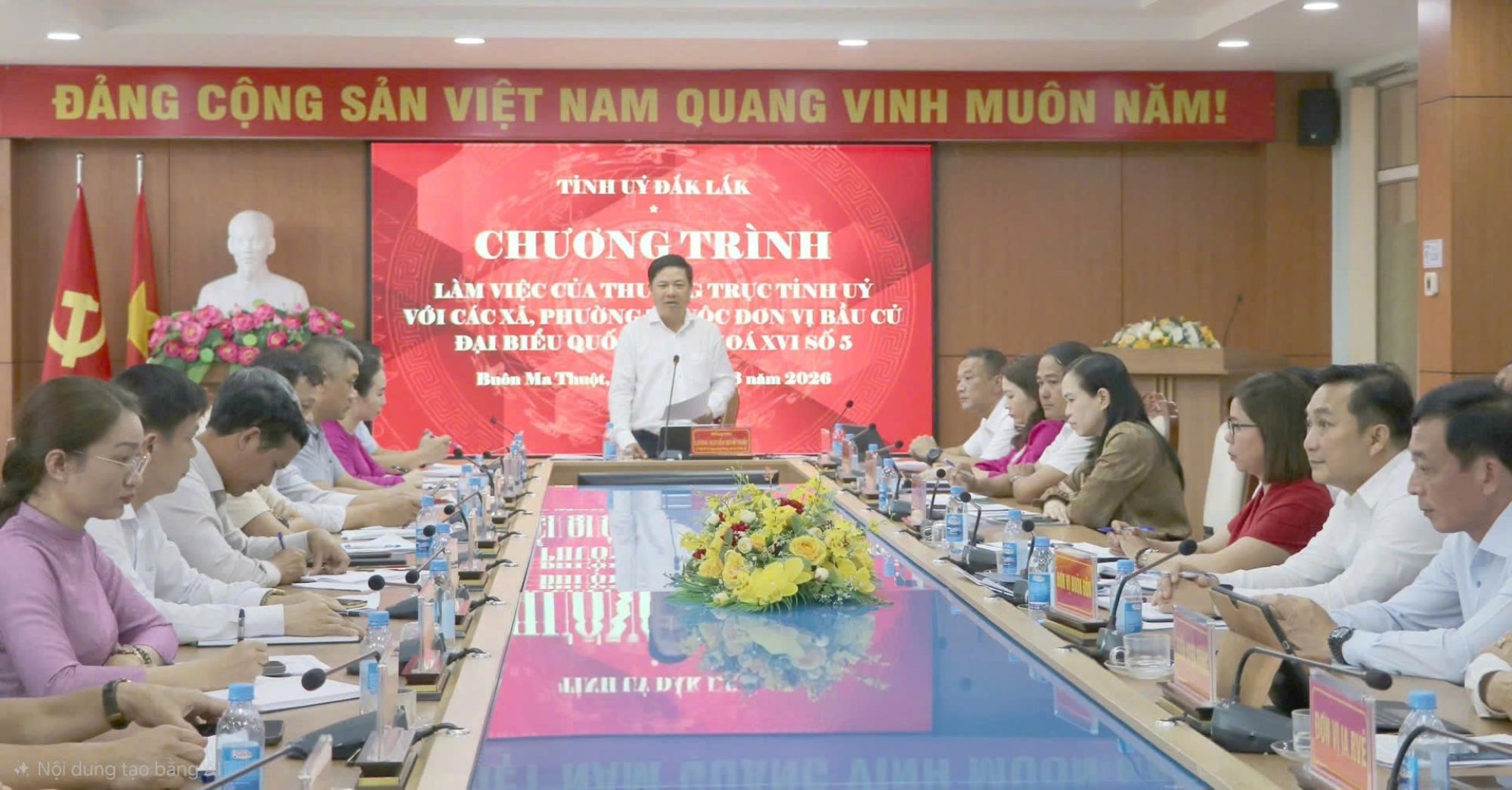 Chiều 3/3/2026, ông Lương Nguyễn Minh Triết, Ủy viên Ban Chấp hành Trung ương Đảng, Bí thư Tỉnh ủy, Trưởng Ban Chỉ đạo công tác bầu cử tỉnh Đắk Lắk đã làm việc với 15 xã, phường thuộc Đơn vị bầu cử Đại biểu Quốc hội khóa XVI số 5 về tình hình, tiến độ triển khai công tác bầu cử Đại biểu Quốc hội khóa XVI và đại biểu HĐND các cấp nhiệm kỳ 2026–2031. Các địa phương đang tập trung chuẩn bị theo đúng quy trình, tiến độ, bảo đảm dân chủ, khách quan, đúng pháp luật để tổ chức thành công ngày hội bầu cử của toàn dân.