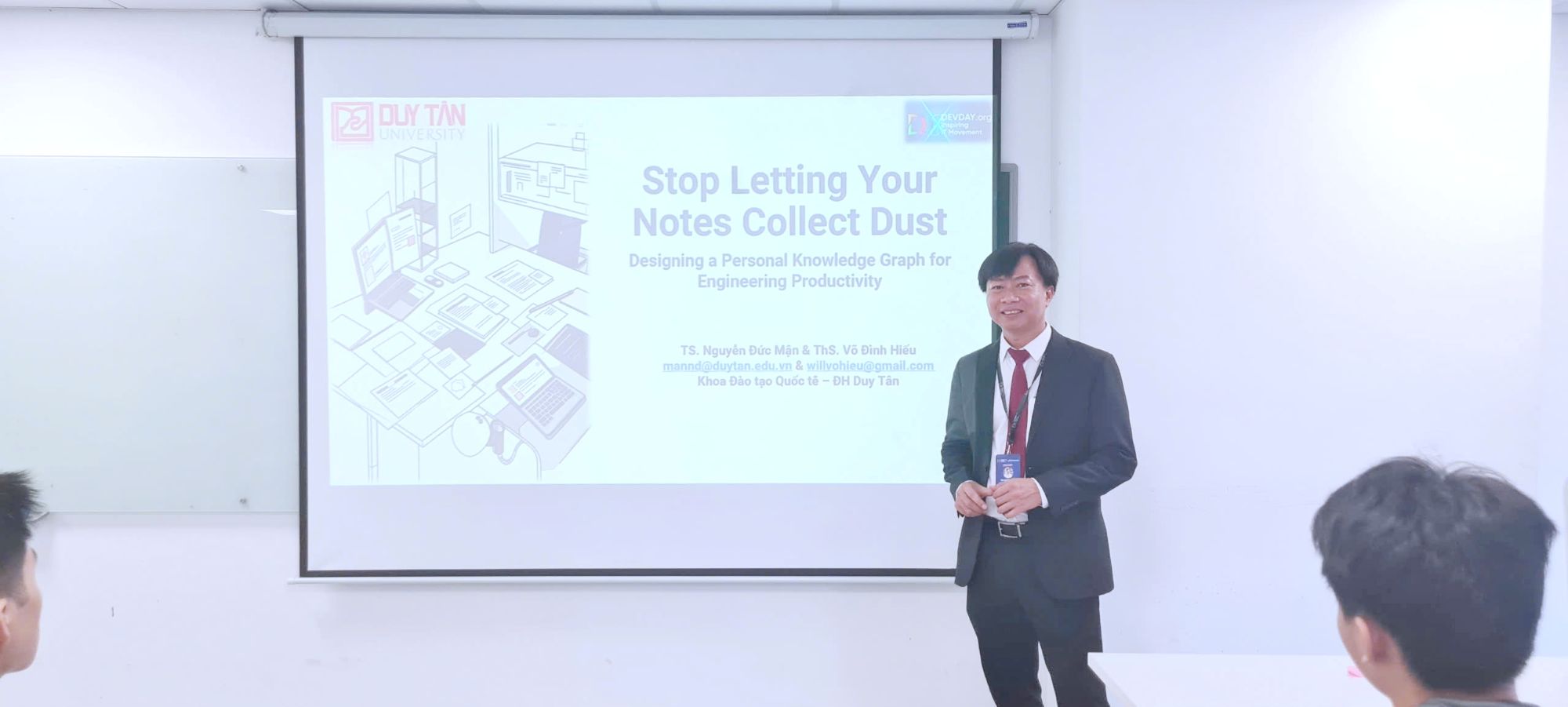 “Đừng để ghi chú của bạn bám bụi: Thiết kế đồ thị tri thức cá nhân để tối ưu năng suất kỹ thuật” là đề tài được trình bày tại DevDay 2026 bởi TS. Nguyễn Đức Mận và ThS. Võ Đình Hiếu (Khoa Quan hệ Quốc tế – Đại học Duy Tân).