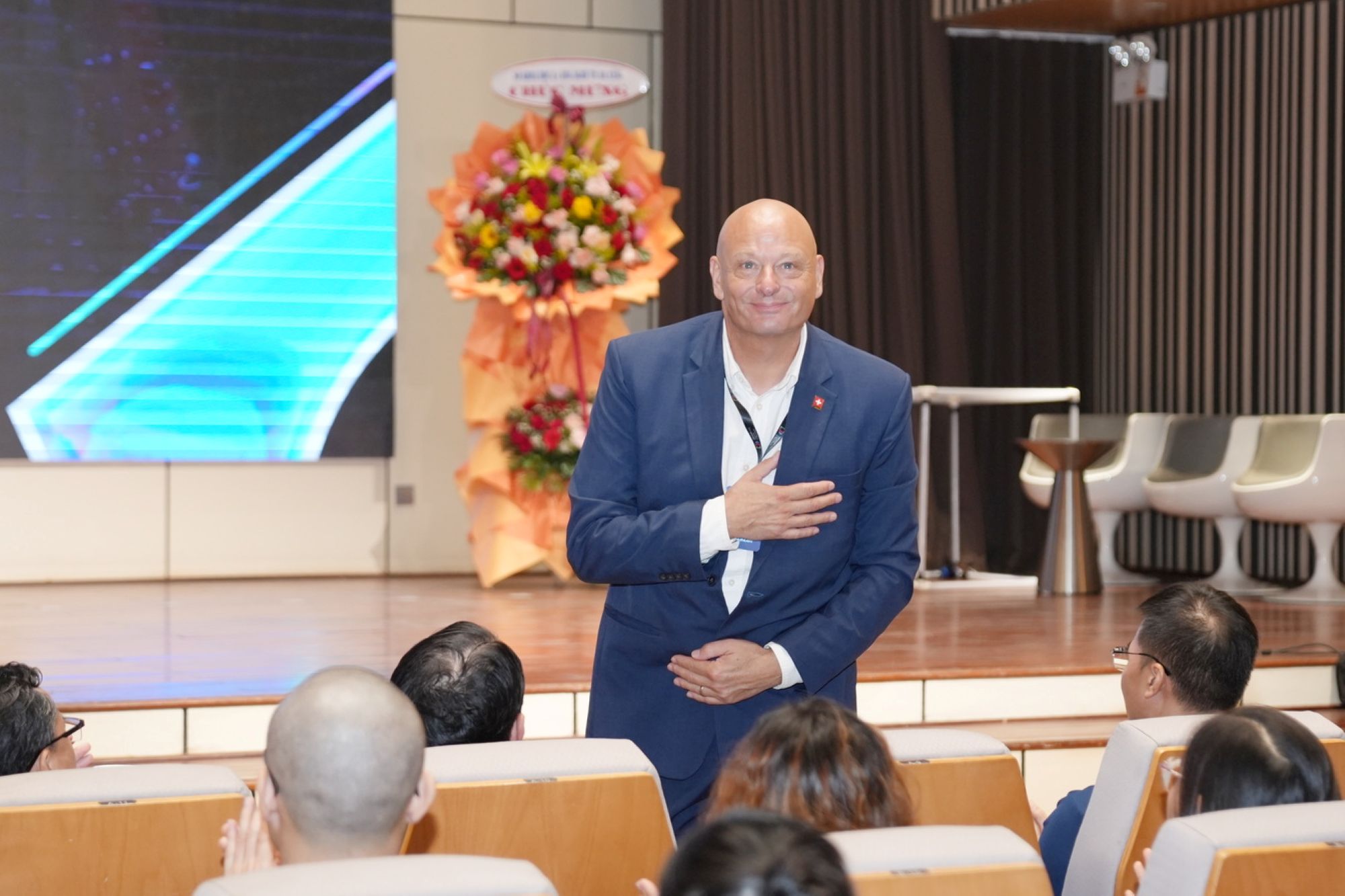 Đến từ Axon Active (Thụy Sỹ), CEO Markus Baur chia sẻ với các bạn trẻ về “những điều mà tôi biết mọi người đang rất băn khoăn”: “Điều tôi thực sự muốn nói là việc học các công cụ AI có thể chỉ mất vài tháng. Nhưng để xây dựng kiến thức chuyên sâu trong một ngành công nghiệp, phải mất nhiều năm. Trong tương lai, thành công sẽ đến từ sự kết hợp của cả hai: kỹ năng AI vững chắc và chuyên môn sâu rộng trong một lĩnh vực cụ thể.”