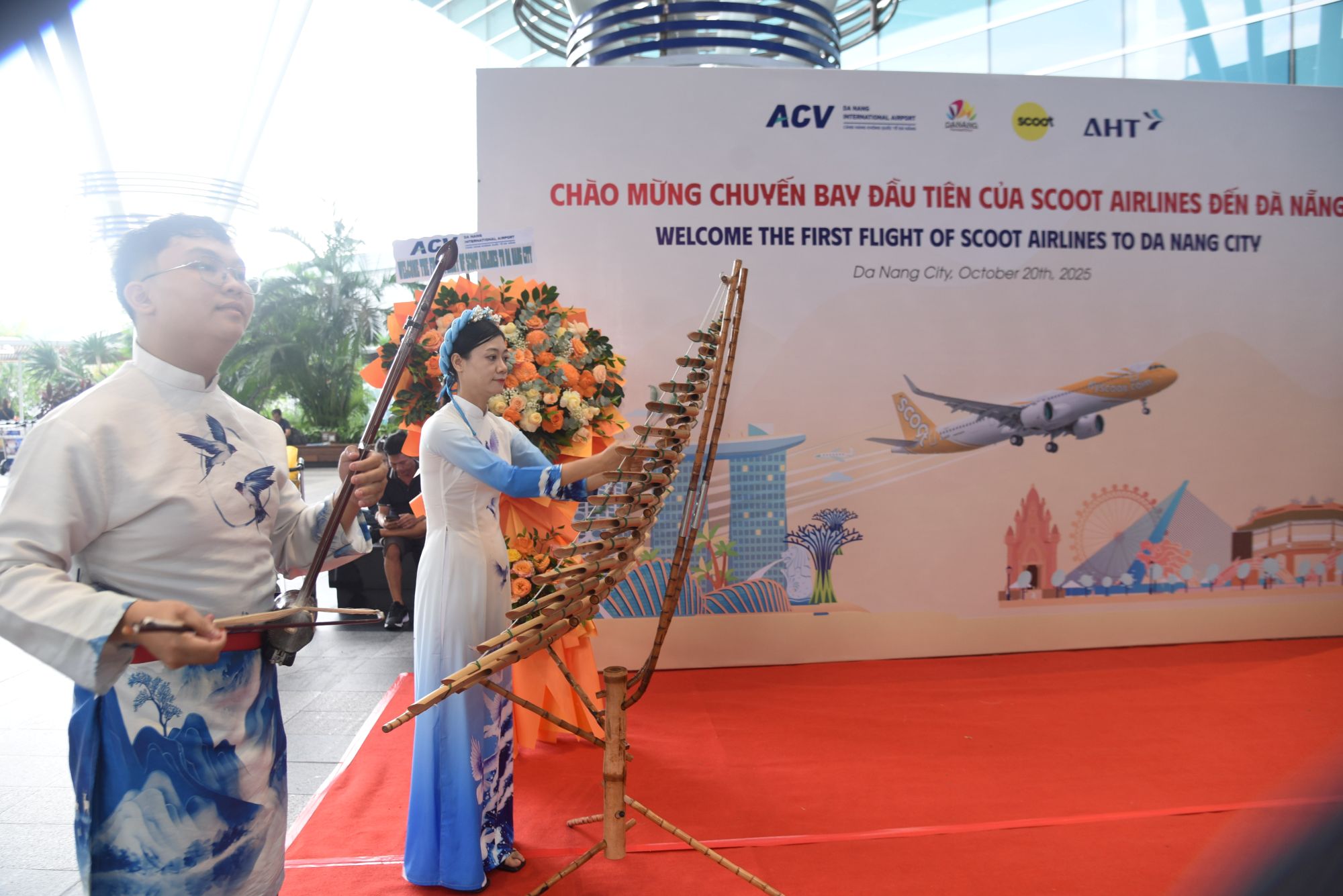 Biểu diễn nhạc cụ truyền thống chào đón chuyến bay đầu tiên của Hãng hàng không Scoot Airlines đến Đà à Nẵng. Ảnh: T.Ngọc.