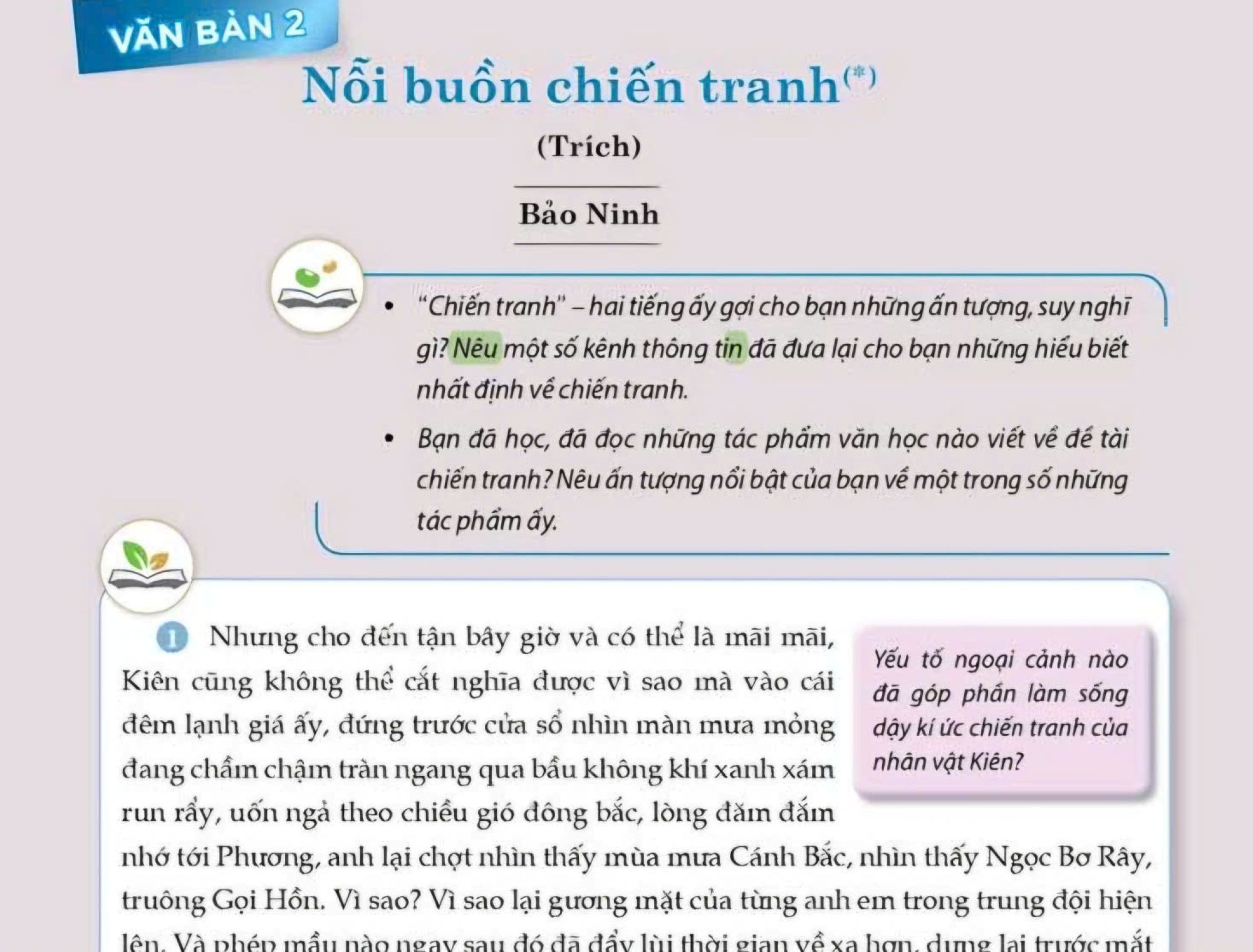 Tác phẩm “Nỗi buồn chiến tranh” của nhà văn Bảo Ninh hiện là một trong những cuốn sách gây nhiều tranh luận nhất về tư tưởng và quan điểm lịch sử. Dù vậy, tác phẩm vẫn được đưa vào chương trình Ngữ văn lớp 12 (năm 2018), một kênh định hướng nhận thức và tư tưởng cho thế hệ trẻ. Nhiều ý kiến cho rằng cuốn sách được viết với bút pháp tự do, cảm tính, có yếu tố hư cấu, bịa đặt, bôi nhọ sự nghiệp chống Mỹ của nhân dân, xúc phạm những người đã hy sinh và thậm chí “khai tử cả một thế hệ chiến đấu vì dân tộc”, vì thế chưa thật sự phù hợp để đưa vào hệ thống giáo trình chính thống của Việt Nam.