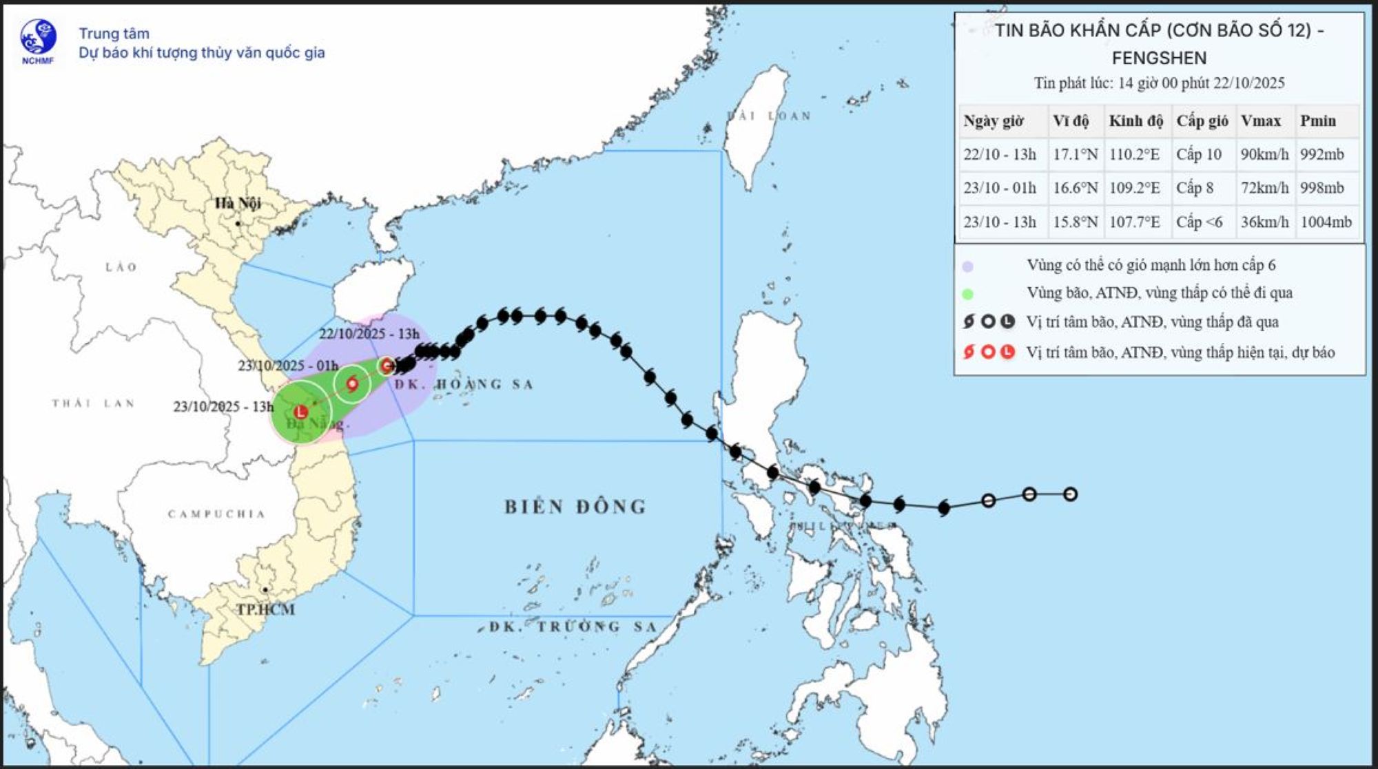 Trung tâm dự báo khi tượng thủy văn quốc gia, trong bản tin phát lúc 14h chiều nay (22/10) cho biết, hồi 13 giờ ngày 22/10, vị trí tâm bão ở vào khoảng 17,1 độ Vĩ Bắc; 110,2 độ Kinh Đông, trên vùng biển phía Tây Bắc đặc khu Hoàng Sa, cách Tp. Đà Nẵng khoảng 230km về phía Đông Đông Bắc. Sức gió mạnh nhất vùng gần tâm bão mạnh cấp 10 (89-102km/giờ), giật cấp 12. Di chuyển theo hướng Tây, tốc độ 5-10km/h.