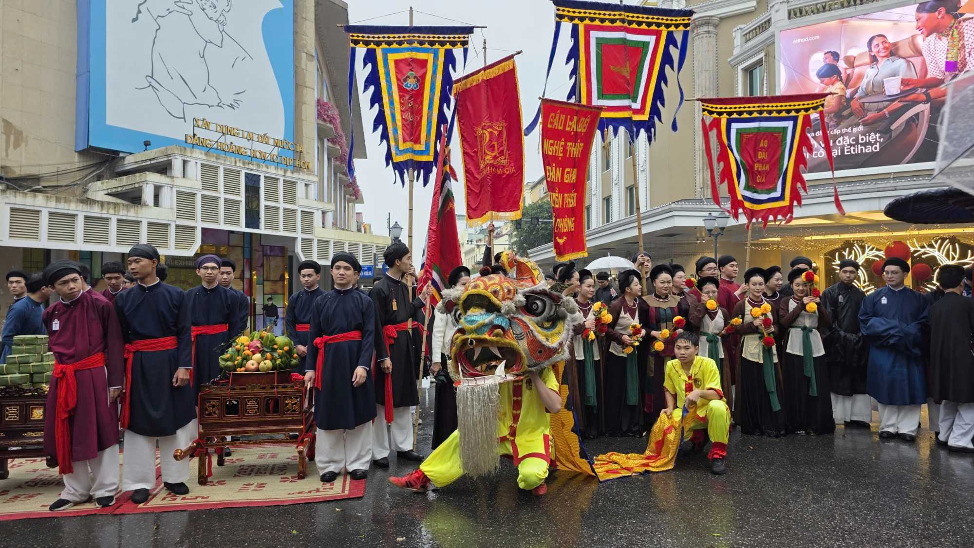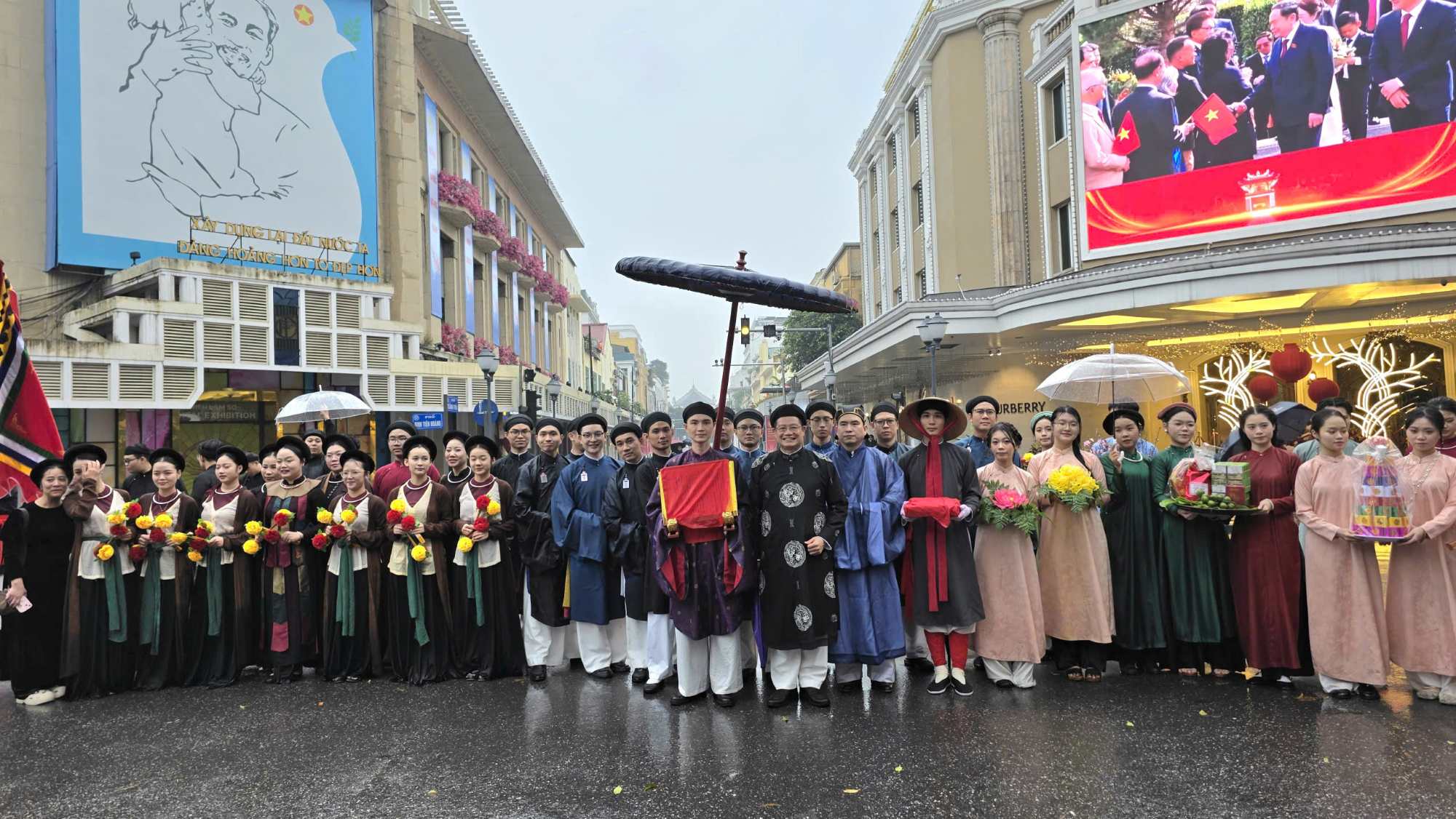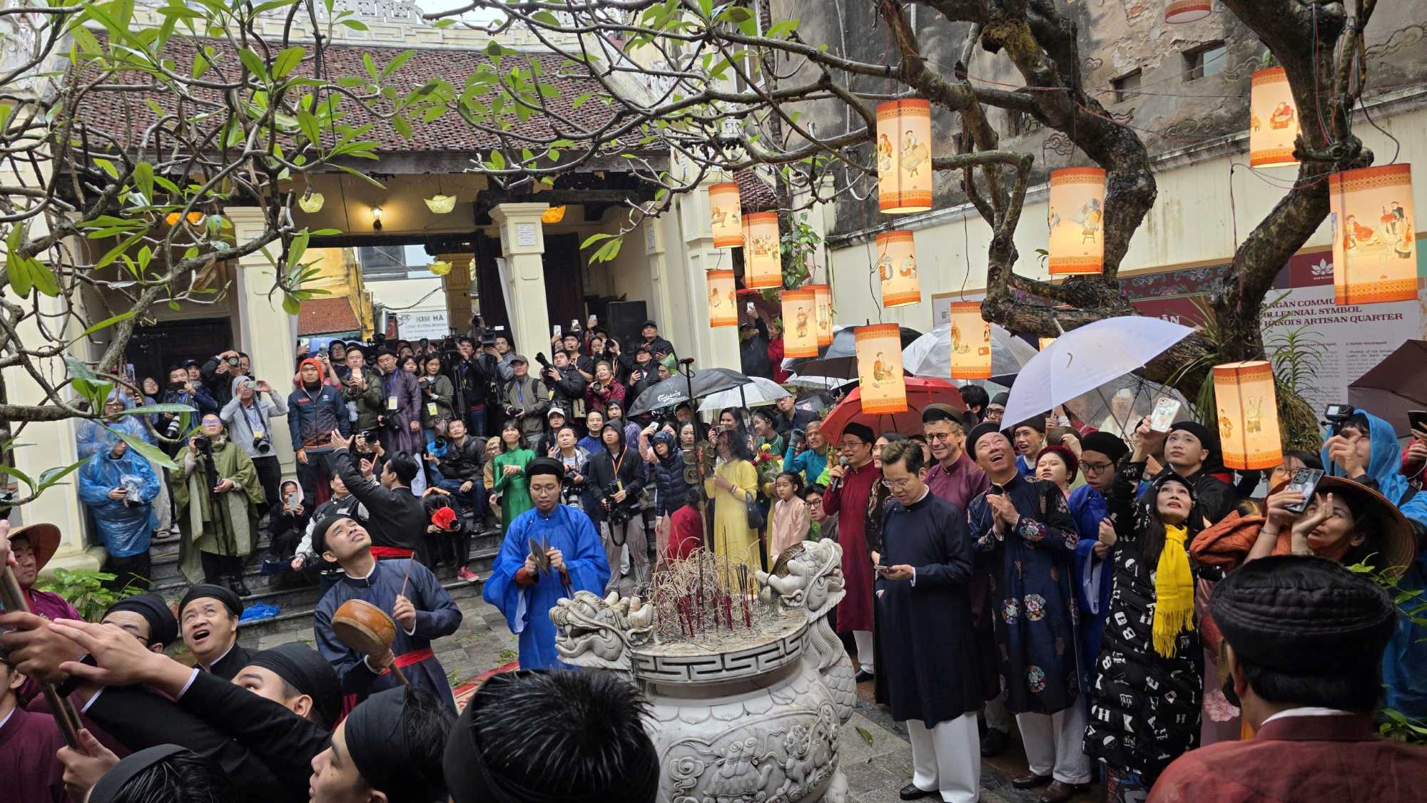 Sáng 8/2/2026, đoàn rước lễ khởi hành từ phố Đào Duy Từ, đi qua các tuyến phố cổ tiêu biểu và dừng tại Ô Quan Chưởng để thực hiện nghi lễ mở cửa ô, một nghi thức mang tính biểu tượng, gợi nhắc ký ức về Thăng Long – Kẻ Chợ xưa. Dù thời tiết không thuận lợi, mưa rét kéo dài, số lượng người tham gia vẫn rất đông, đội hình đoàn rước vẫn giữ được sự trang nghiêm, nhịp nhàng, thể hiện tinh thần trân trọng di sản và ý thức cộng đồng cao.