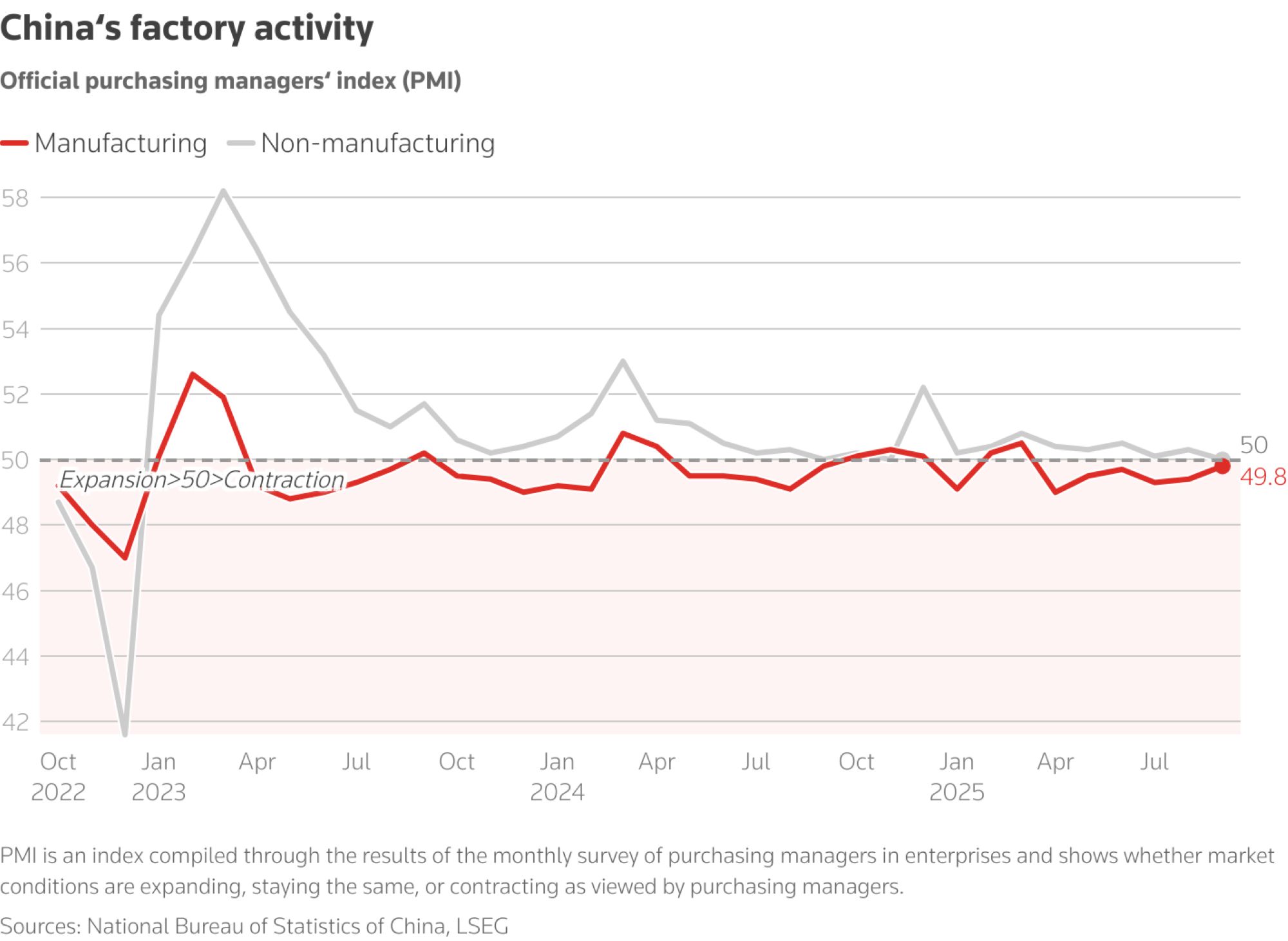 Chỉ số nhà quản lý mua hàng (PMI) chính thức của Trung Quốc tăng lên 49,8 điểm trong tháng 9, mức cao nhất trong sáu tháng, từ 49,4 điểm của tháng 8. Dù vẫn dưới ngưỡng 50 – ranh giới giữa tăng trưởng và suy thoái – con số này vượt dự báo trung bình 49,6 trong cuộc thăm dò của Reuters.