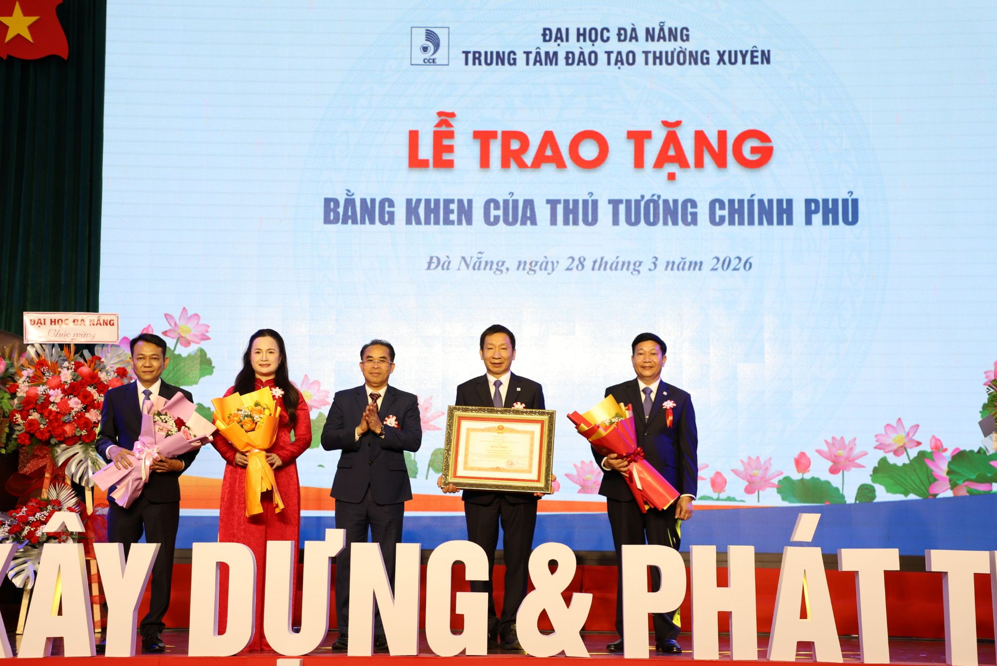 Thừa ủy quyền của Thủ tướng Chính phủ, ông Trần Anh Tuấn, Phó Chủ tịch UBND TP Đà Nẵng trao bằng khen của Thủ tướng Chính phủ đến đại diện Trung tâm đào tạo thường xuyên (CCE) – Đại học Đà Nẵng. Ảnh: Thanh Nhã.