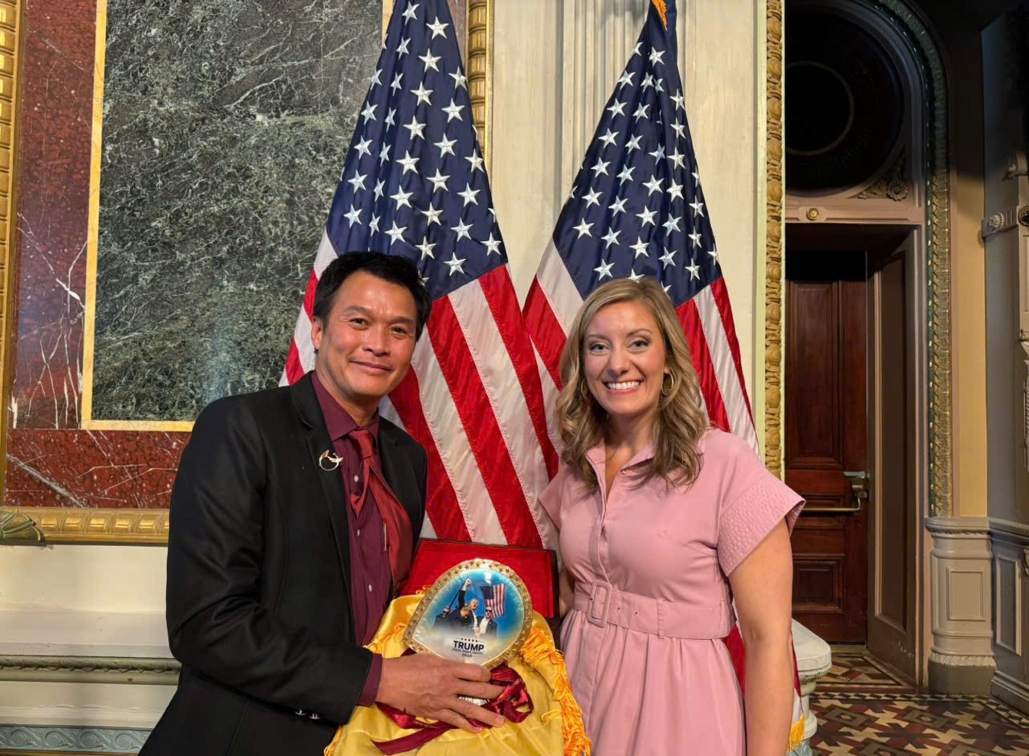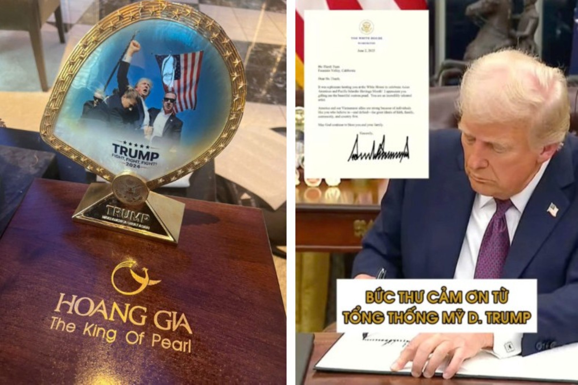 Tại sự kiện, ông đã nhận được thư cảm ơn từ Tổng thống Hoa Kỳ Donald Trump. Lá thư do đích thân Tổng thống ký, với tiêu đề thể hiện niềm vui được tiếp đón ông tại Nhà Trắng, đồng thời bày tỏ sự trân trọng đối với món quà đặc biệt mà nghệ nhân gửi tặng. Tặng phẩm là một tác phẩm nghệ thuật chế tác từ ngọc trai Maxima nuôi tại vùng biển Khánh Hòa (Mother of Pearl), khắc họa hình ảnh Tổng thống trong một “khoảnh khắc lịch sử năm 2024”. Phần viền và đế tác phẩm được bao bọc bằng vàng thật, vừa tôn vinh giá trị thẩm mỹ, vừa thể hiện ý nghĩa trường tồn và sự trân quý.