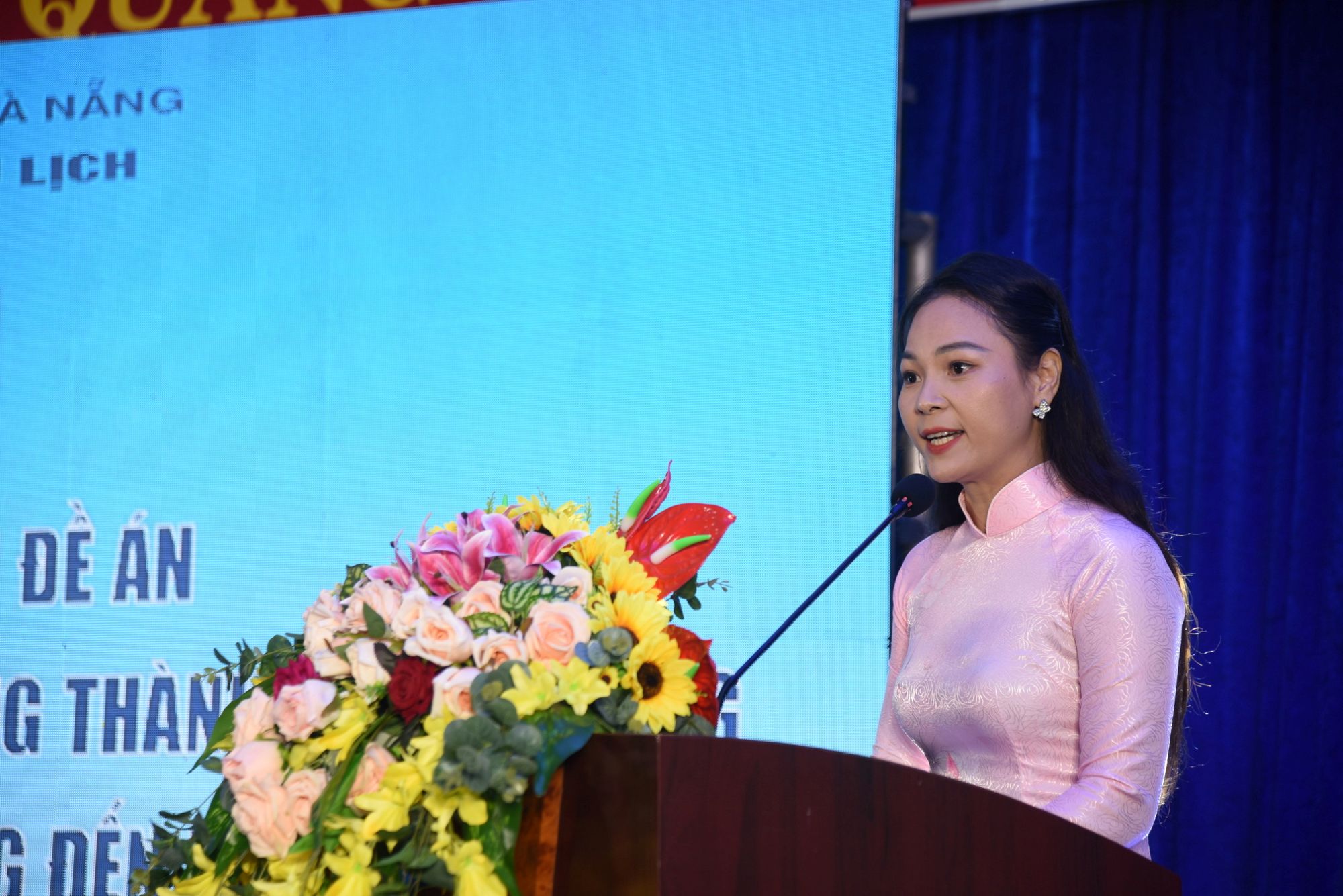 Bà Đỗ Thị Hạnh, chuyên viên Trung tâm Cung ứng Dịch vụ Sự nghiệp công xã Hòa Vang trình bày tham luận “Hiệu quả từ thực tiễn các mô hình phát triển văn hóa đọc trên địa bàn huyện Hòa Vang (cũ)”. Ảnh: T.Ngọc.