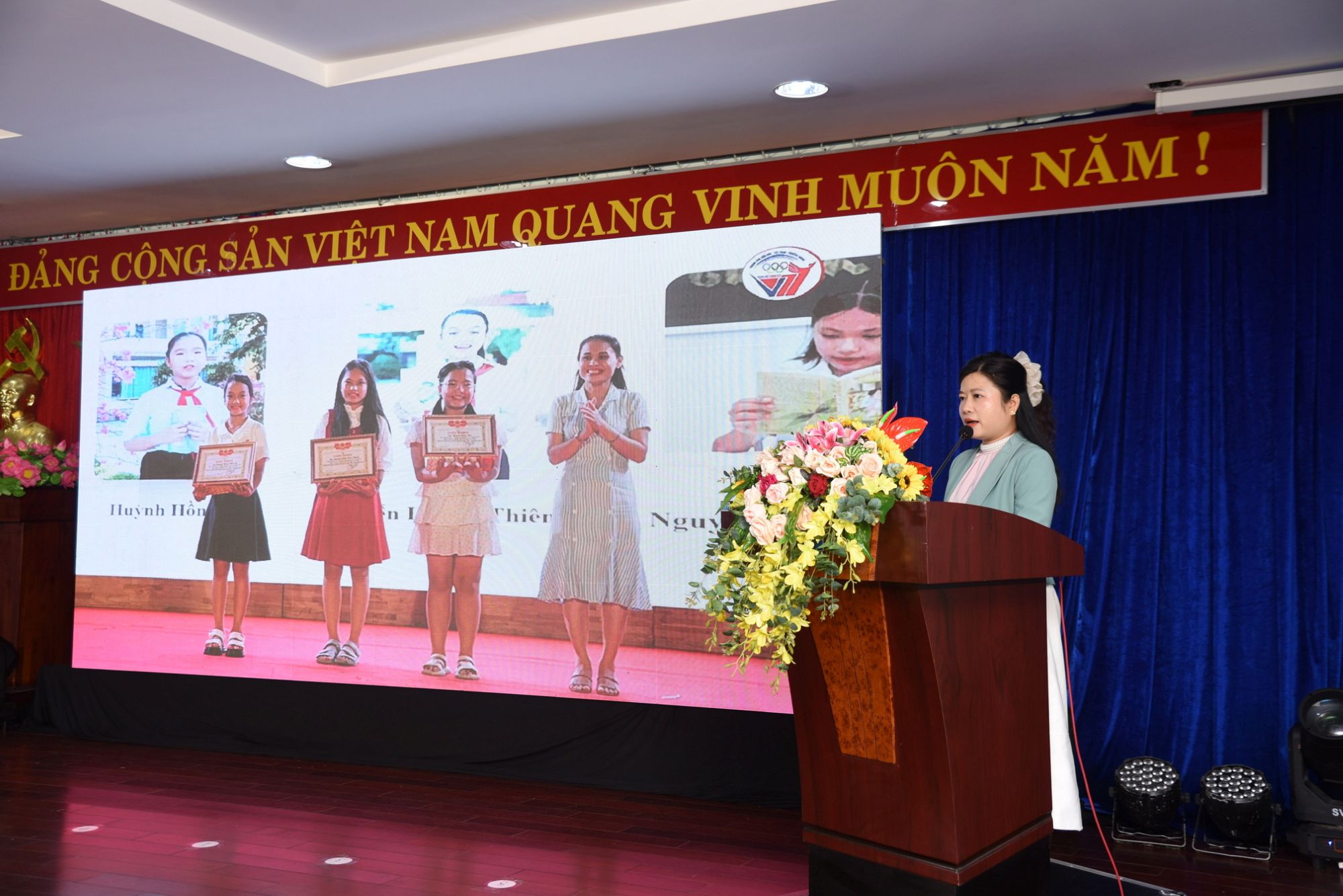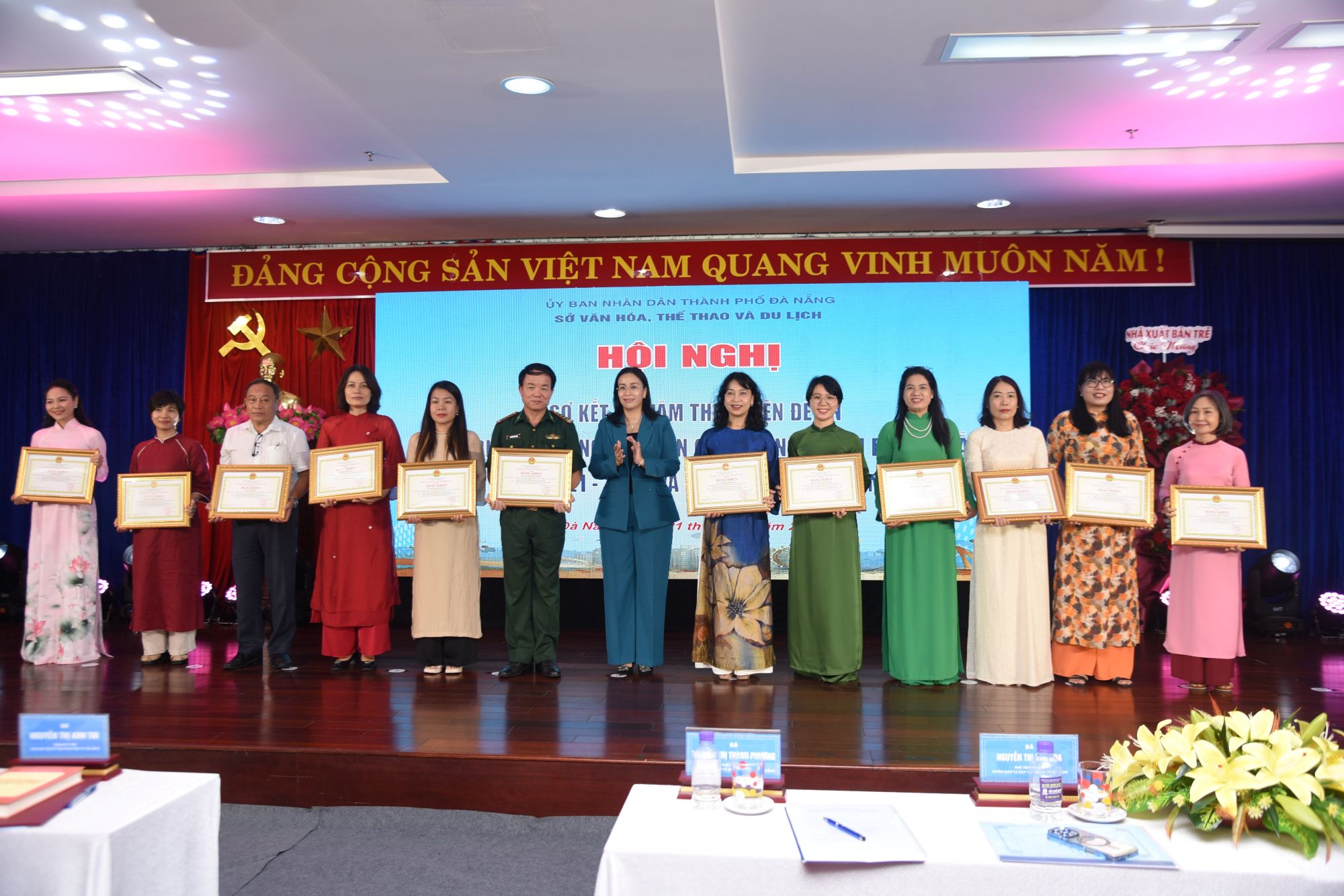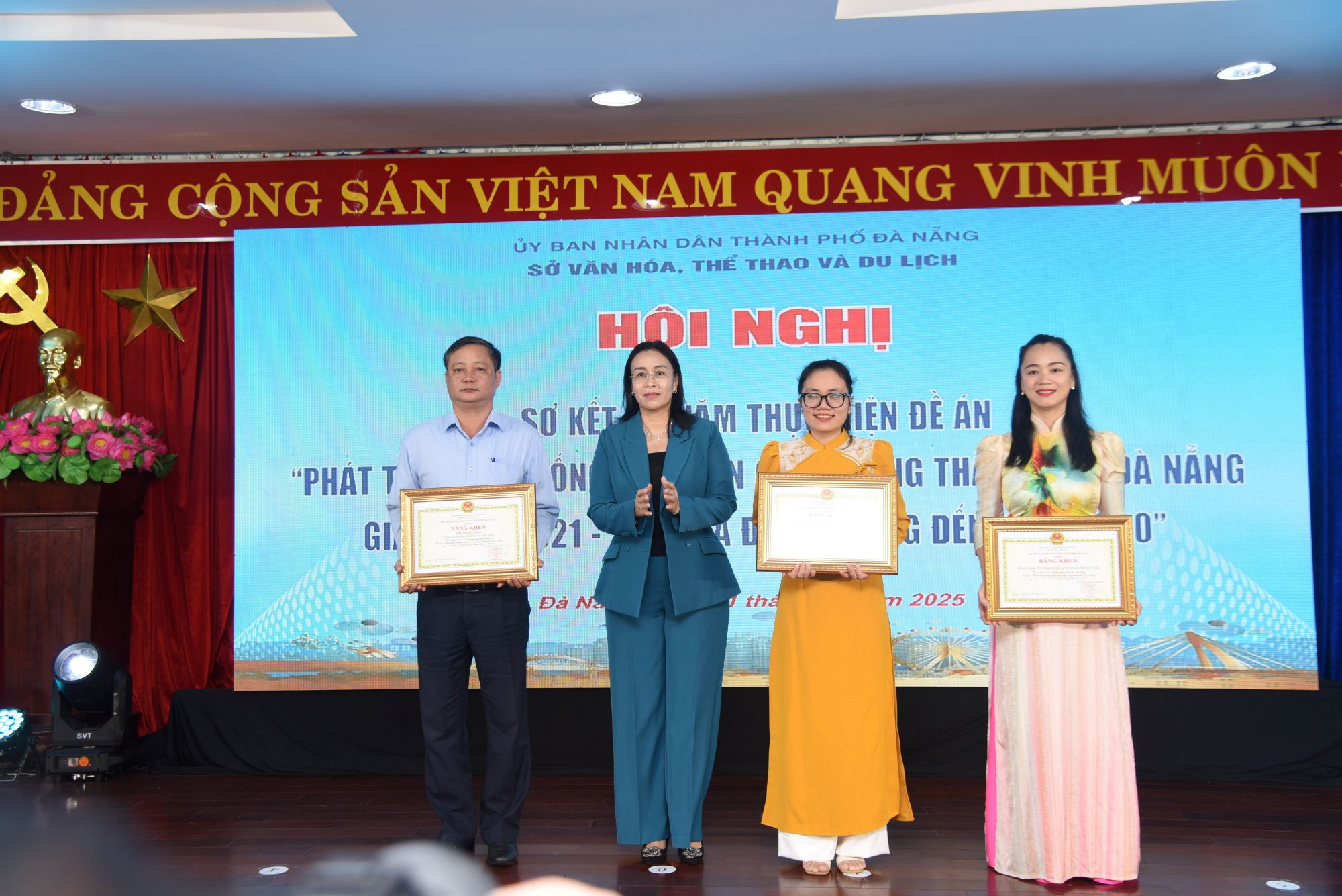 Phó Chủ tịch UBND thành phố Đà Nẵng, bà Nguyễn Thị Anh Thi trao Bằng khen của Chủ tịch UBND thành phố đến đại diện 3 đơn vị: Sở Giáo dục và Đào tạo ; Sở Văn hoá, Thể thao và Du lịch;  Thư viện Đà Nẵng. Ảnh: T.Ngọc.