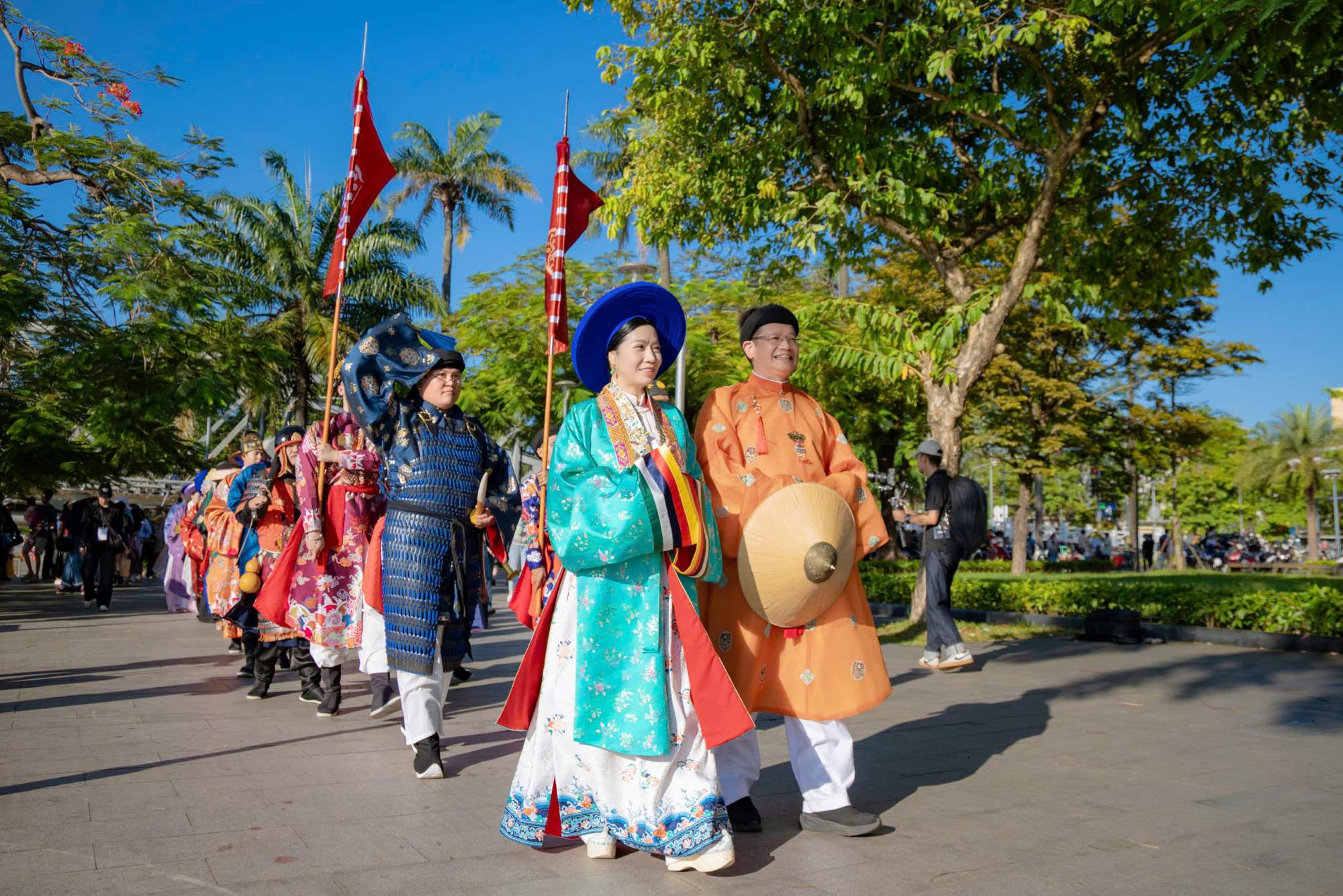 Dọc theo tuyến đi bộ dài gần 3km qua những địa danh biểu tượng của Huế như Nghênh Lương Đình, cầu Trường Tiền, đường Nguyễn Đình Chiểu, cầu gỗ Lim đến quảng trường Quốc Học, người dân và du khách được hòa mình vào một cuộc diễu hành Việt phục công phu, quy mô lớn mang tên “Việt Phong Hội Tụ – Tinh hoa của văn hoá trang phục Việt truyền thống”. Mười khối diễu hành với bản sắc riêng lần lượt tiến bước trong âm vang nhạc lễ, tiếng chén gõ, sanh tiền rộn ràng, tái hiện không gian văn hóa xưa đầy kiêu hãnh – nơi mỗi người như một đóa hoa khoe sắc giữa vườn di sản văn hoá Việt.