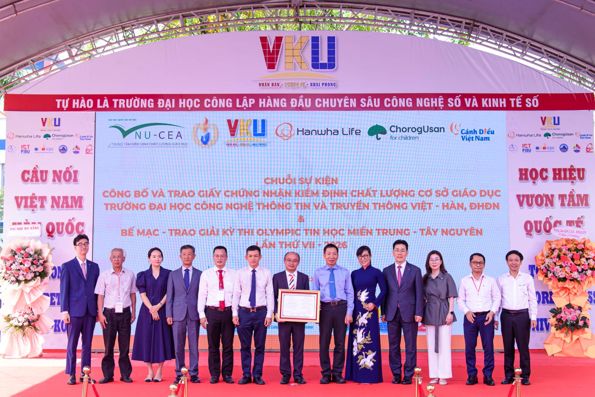 Lan tỏa mạnh mẽ thông điệp về chất lượng, đổi mới sáng tạo và khát vọng phát triển bền vững, sáng ngày 12/4/2026, cũng trong khuôn khổ tổng kết-bế mạc vòng Chung kết Kỳ thi Olympic Tin học Miền Trung – Tây Nguyên VII, VKU – Đại học Đà Nẵng đã tổ chức Lễ công bố và trao Giấy chứng nhận kiểm định chất lượng cơ sở giáo dục, cột mốc đặc biệt quan trọng, khẳng định uy tín, chất lượng đào tạo và vị thế của Nhà trường trong hệ thống giáo dục đại học Việt Nam. Trước đó, VKU cũng đã hoàn thành toàn diện quy trình kiểm định chất lượng theo quy định của Bộ Giáo dục và Đào tạo.