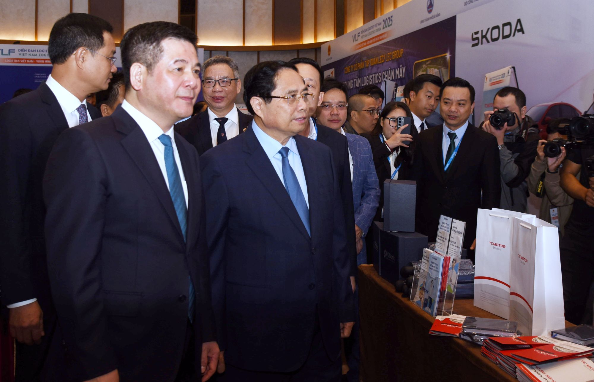 Bộ trưởng Bộ Công Thương Nguyễn Hồng Diên (bìa trái ảnh) và Thủ tướng Chính phủ Phạm Minh Chính thăm không gian giới thiệu của Doanh nghiệp Logistics Việt Nam (Đà Nẵng, 29/11/2025). Ảnh: T.Ngọc.